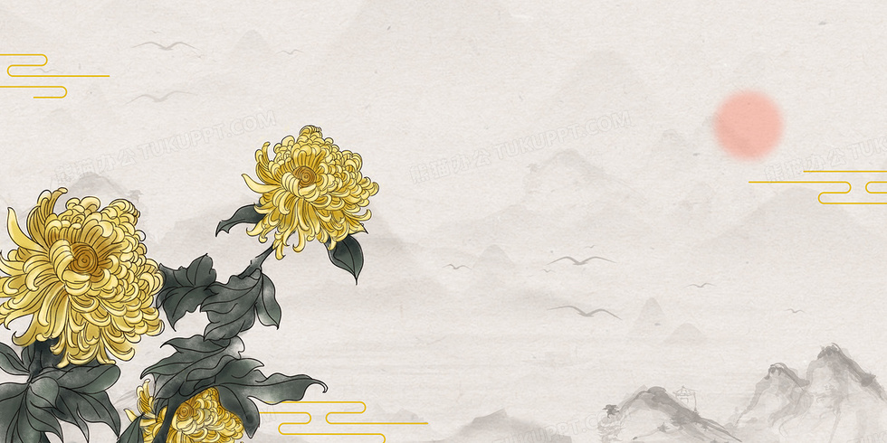 本作品内容为复古中国风菊花淡雅山水淡彩背景, 格式为 psd, 大小67 MB, 图片尺寸为4724 x 2362, 作品中背景图片无需修改, 源文件无水印,可以直接使用, 欢迎使用熊猫办公。 如认为平台内容涉嫌侵权,可通过邮件:tousu@tukuppt.com提出书面通知,我们将及时处理。