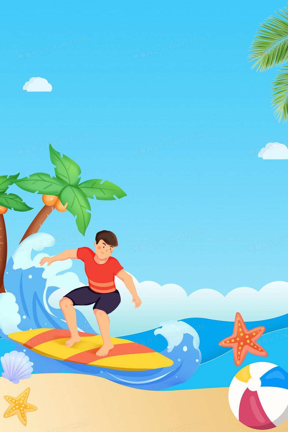 本作品内容为创意手绘卡通海滩冲浪夏天海报背景, 格式为 psd, 大小41 MB, 图片尺寸为3543 x 5315, 作品中背景图片无需修改, 源文件无水印,可以直接使用, 欢迎使用熊猫办公。 如认为平台内容涉嫌侵权,可通过邮件:tousu@tukuppt.com提出书面通知,我们将及时处理。