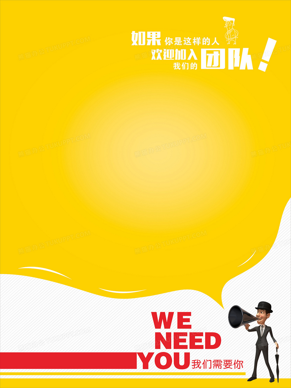 本作品内容为黄色卡通人物招聘广告, 格式为 cdr, 图片尺寸为5316 x 7088, 作品中背景图片无需修改, 源文件无水印,可以直接使用, 欢迎使用熊猫办公。 如认为平台内容涉嫌侵权,可通过邮件:tousu@tukuppt.com提出书面通知,我们将及时处理。
