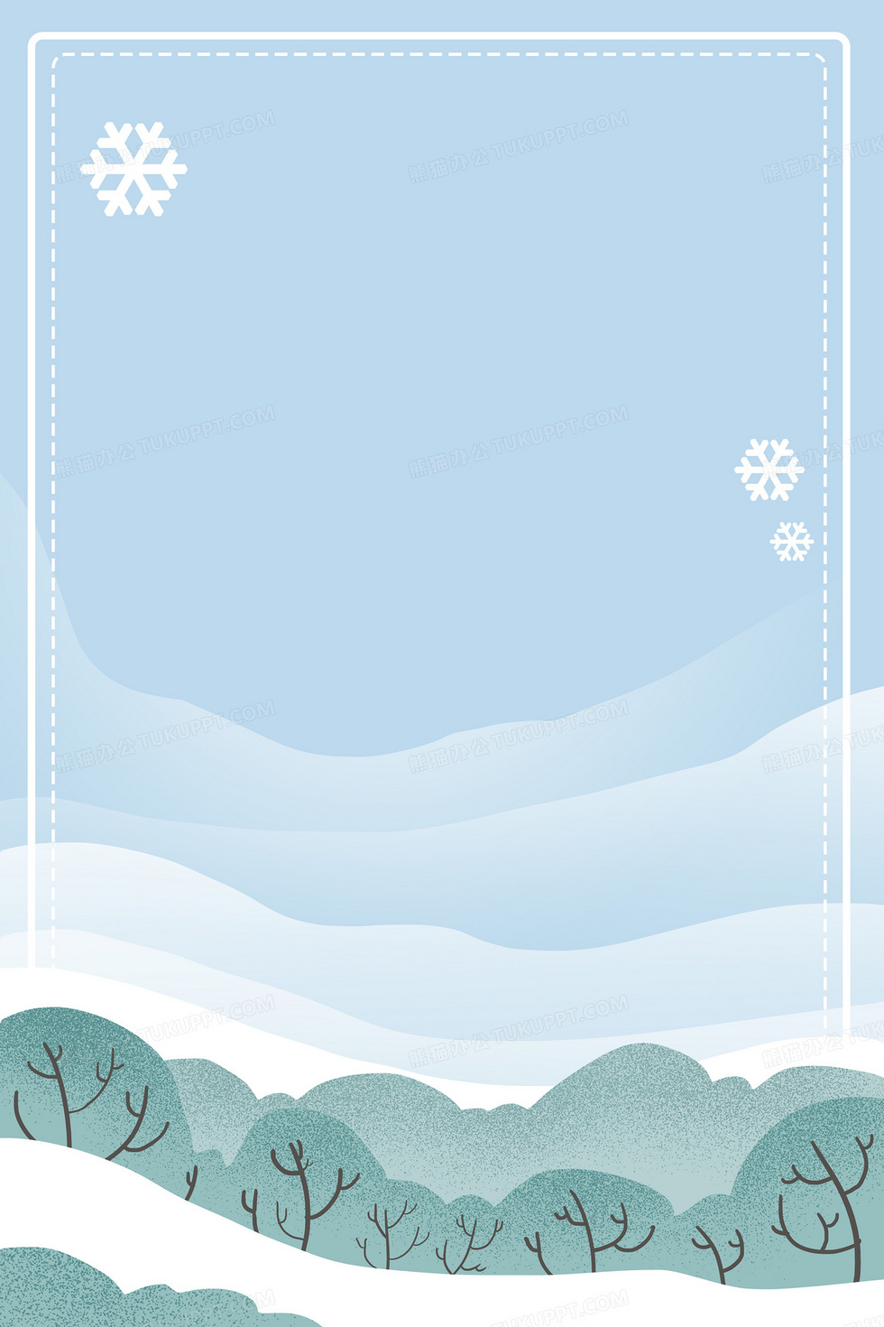 本作品内容为淡雅的冬天雪地树林唯美边框背景, 格式为 psd, 大小7 MB, 图片尺寸为3543 x 5315, 作品中背景图片无需修改, 源文件无水印,可以直接使用, 欢迎使用熊猫办公。 如认为平台内容涉嫌侵权,可通过邮件:tousu@tukuppt.com提出书面通知,我们将及时处理。