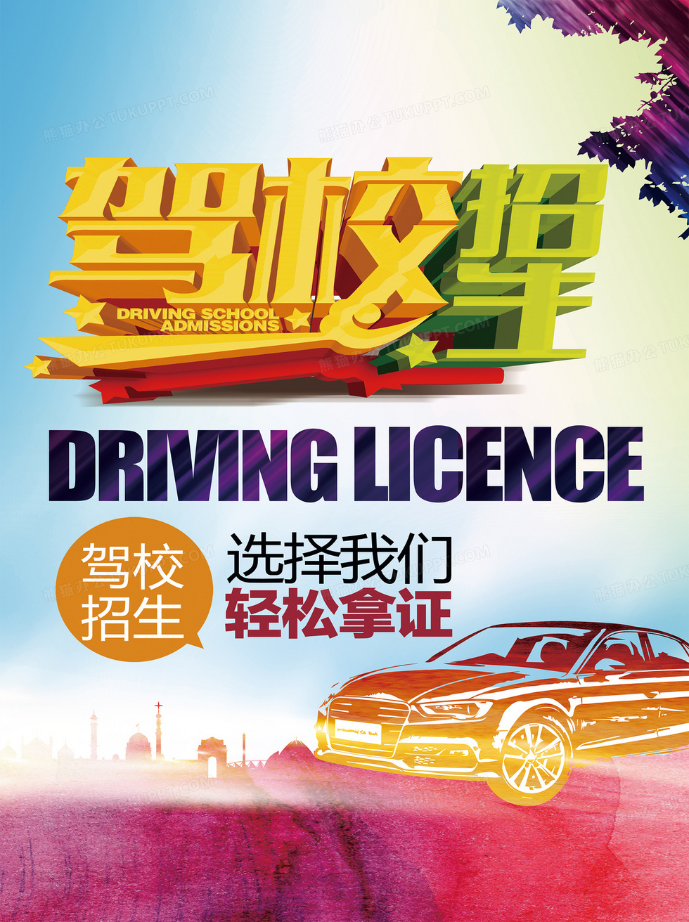 本作品内容为驾校招生广告背景, 格式为 psd, 图片尺寸为3506 x 4693, 作品中背景图片无需修改, 源文件无水印,可以直接使用, 欢迎使用熊猫办公。 如认为平台内容涉嫌侵权,可通过邮件:tousu@tukuppt.com提出书面通知,我们将及时处理。