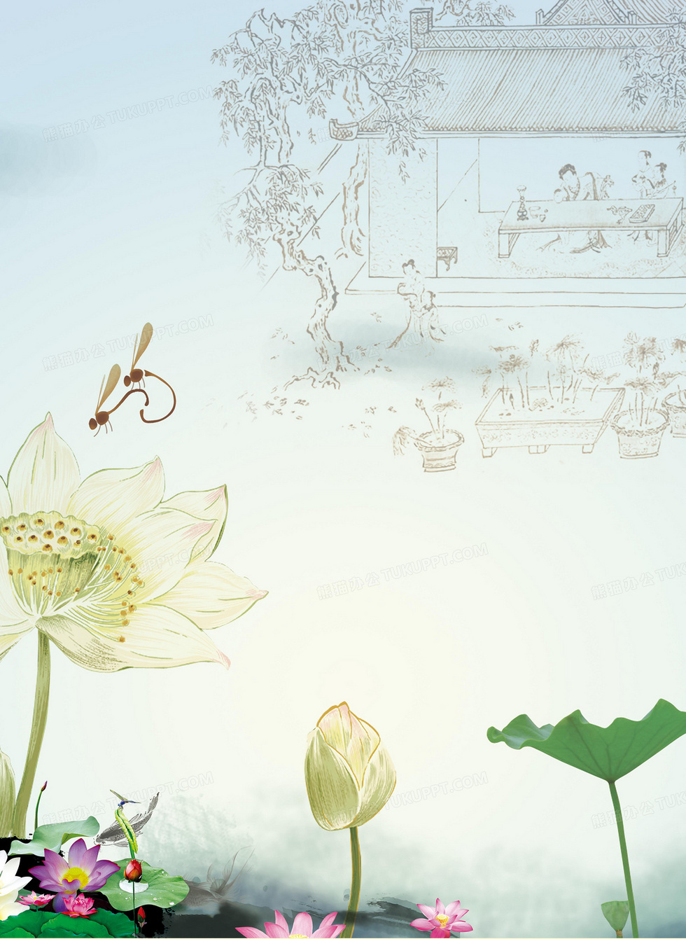 本作品内容为中国风清新莲花展板背景, 格式为 psd, 图片尺寸为3431 x 4694, 作品中背景图片无需修改, 源文件无水印,可以直接使用, 欢迎使用熊猫办公。 如认为平台内容涉嫌侵权,可通过邮件:tousu@tukuppt.com提出书面通知,我们将及时处理。