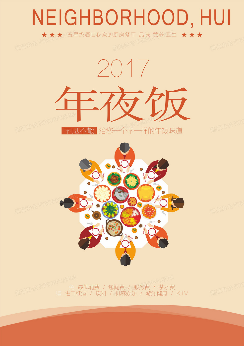 本作品内容为2017年年夜饭海报背景模板, 格式为 cdr, 图片尺寸为3471 x 4908, 作品中背景图片无需修改, 源文件无水印,可以直接使用, 欢迎使用熊猫办公。 如认为平台内容涉嫌侵权,可通过邮件:tousu@tukuppt.com提出书面通知,我们将及时处理。