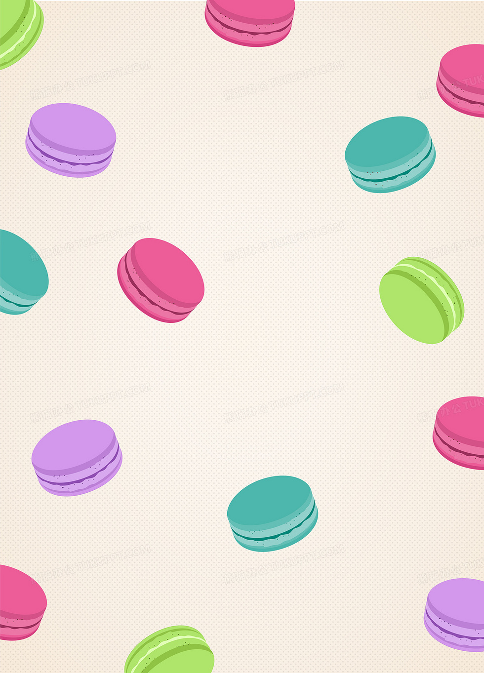 本作品内容为矢量清新文艺食物马卡龙蛋糕背景, 格式为 ai, 图片尺寸为5855 x 8142, 作品中背景图片无需修改, 源文件无水印,可以直接使用, 欢迎使用熊猫办公。 如认为平台内容涉嫌侵权,可通过邮件:tousu@tukuppt.com提出书面通知,我们将及时处理。