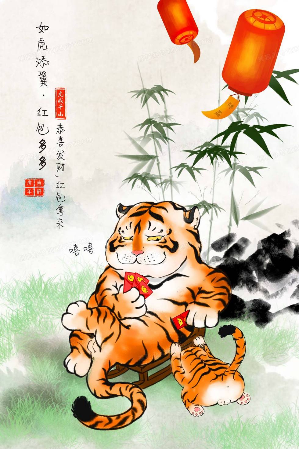 本作品内容为虎年水墨风趣味红包多多老虎插画背景, 格式为 psd, 大小68 MB, 图片尺寸为2362 x 3543, 作品中背景图片无需修改, 源文件无水印,可以直接使用, 欢迎使用熊猫办公。 如认为平台内容涉嫌侵权,可通过邮件:tousu@tukuppt.com提出书面通知,我们将及时处理。