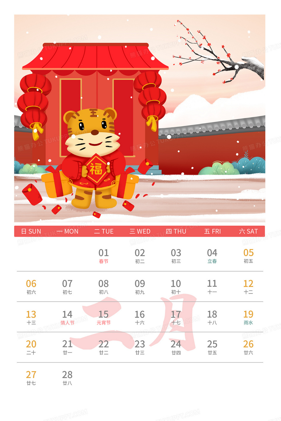 本作品内容为2022虎年日历二月份插画背景, 格式为 psd, 大小30 MB, 图片尺寸为3543 x 5315, 作品中背景图片无需修改, 源文件无水印,可以直接使用, 欢迎使用熊猫办公。 如认为平台内容涉嫌侵权,可通过邮件:tousu@tukuppt.com提出书面通知,我们将及时处理。