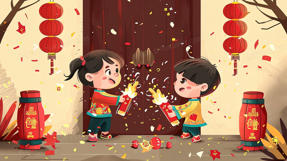 本作品内容为春节门口放炮竹的两个小孩插画, 格式为 jpg, 大小3 MB, 图片尺寸为2912 x 1632, 源文件无水印, 欢迎使用熊猫办公。 如认为平台内容涉嫌侵权,可通过邮件:tousu@tukuppt.com提出书面通知,我们将及时处理。