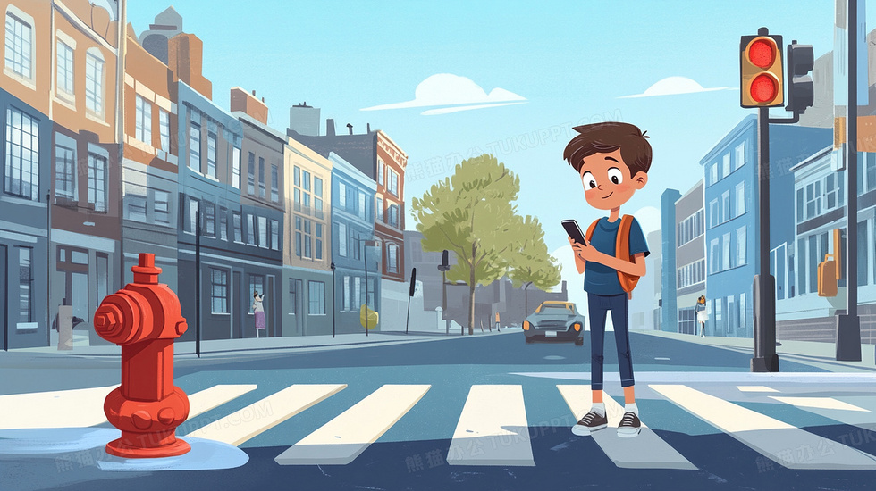 本作品内容为小男孩过马路玩手机闯红灯插画, 格式为 jpg, 大小3 MB, 图片尺寸为2912 x 1632, 源文件无水印, 欢迎使用熊猫办公。 如认为平台内容涉嫌侵权,可通过邮件:tousu@tukuppt.com提出书面通知,我们将及时处理。