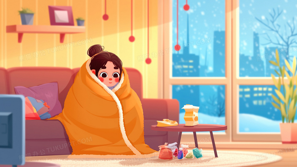 本作品内容为冬季宅家裹被子保暖的女孩插画, 格式为 jpg, 大小2 MB, 图片尺寸为2912 x 1632, 源文件无水印, 欢迎使用熊猫办公。 如认为平台内容涉嫌侵权,可通过邮件:tousu@tukuppt.com提出书面通知,我们将及时处理。