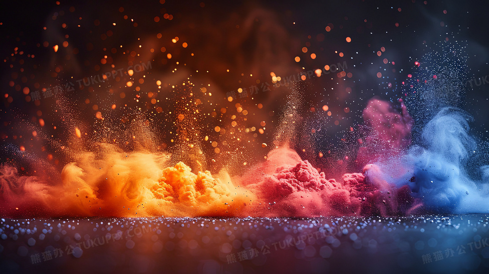 本作品内容为彩色粉末粒子飞溅背景, 格式为 jpg, 大小6 MB, 图片尺寸为2912 x 1632, 作品中背景图片无需修改, 源文件无水印,可以直接使用, 欢迎使用熊猫办公。 如认为平台内容涉嫌侵权,可通过邮件:tousu@tukuppt.com提出书面通知,我们将及时处理。