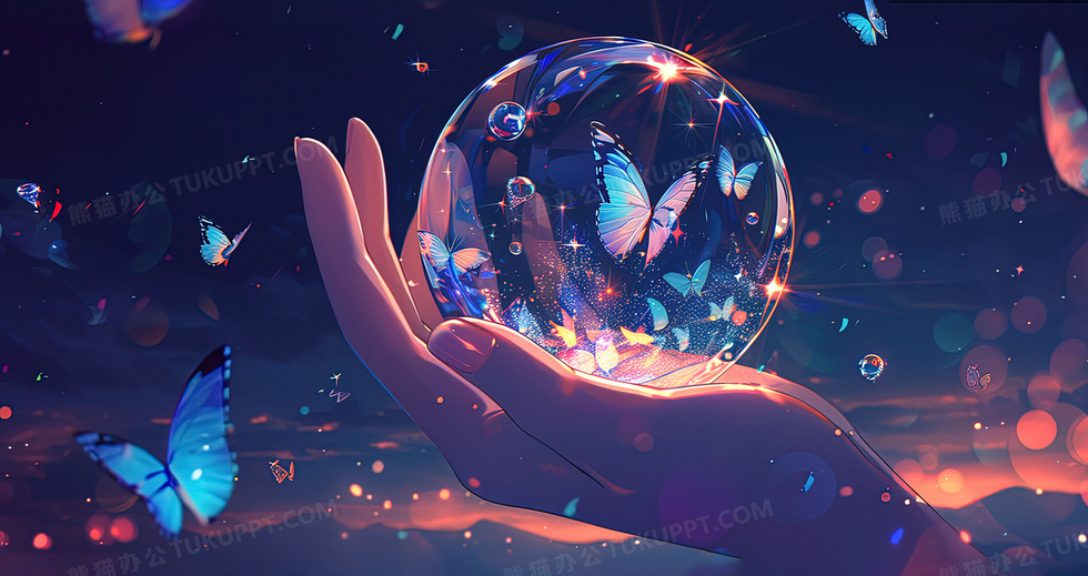 本作品内容为唯美梦幻夜晚捧着发光的气泡蝴蝶插画, 格式为 jpg, 大小5 MB, 图片尺寸为2912 x 1540, 源文件无水印, 欢迎使用熊猫办公。 如认为平台内容涉嫌侵权,可通过邮件:tousu@tukuppt.com提出书面通知,我们将及时处理。