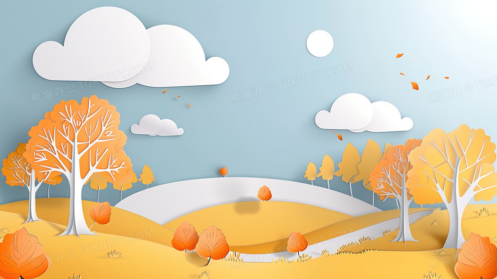 本作品内容为橙色剪纸风秋季树林风景背景, 格式为 jpg, 大小2 MB, 图片尺寸为2912 x 1632, 作品中背景图片无需修改, 源文件无水印,可以直接使用, 欢迎使用熊猫办公。 如认为平台内容涉嫌侵权,可通过邮件:tousu@tukuppt.com提出书面通知,我们将及时处理。
