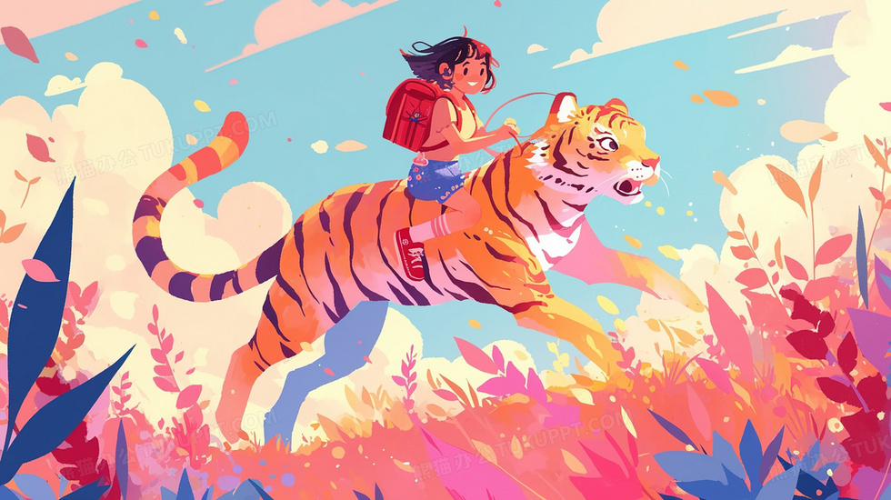 本作品内容为秋天秋老虎骑老虎的女孩创意插画, 格式为 jpg, 大小2 MB, 图片尺寸为2912 x 1632, 源文件无水印, 欢迎使用熊猫办公。 如认为平台内容涉嫌侵权,可通过邮件:tousu@tukuppt.com提出书面通知,我们将及时处理。