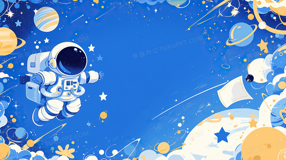 本作品内容为蓝色宇航员航天背景, 格式为 jpg, 大小3 MB, 图片尺寸为2912 x 1632, 作品中背景图片无需修改, 源文件无水印,可以直接使用, 欢迎使用熊猫办公。 如认为平台内容涉嫌侵权,可通过邮件:tousu@tukuppt.com提出书面通知,我们将及时处理。
