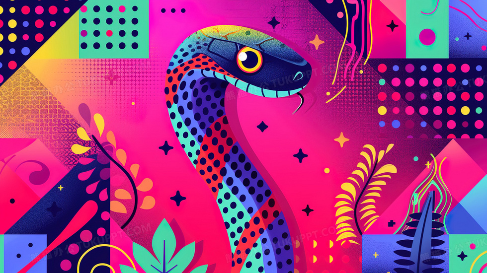 本作品内容为色彩丰富的蛇年背景, 格式为 jpg, 大小3 MB, 图片尺寸为2912 x 1632, 作品中背景图片无需修改, 源文件无水印,可以直接使用, 欢迎使用熊猫办公。 如认为平台内容涉嫌侵权,可通过邮件:tousu@tukuppt.com提出书面通知,我们将及时处理。