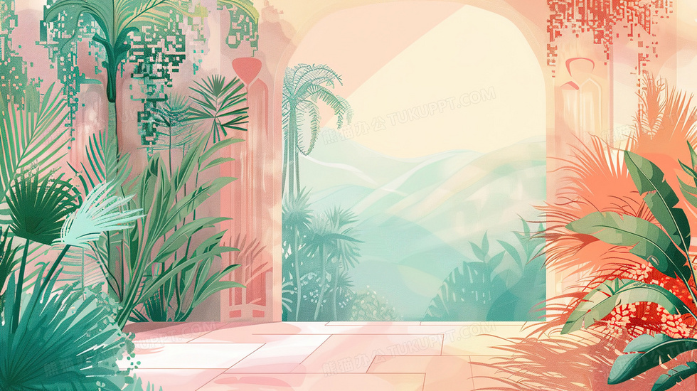 本作品内容为阳光照射拱门植物插画, 格式为 jpg, 大小4 MB, 图片尺寸为2912 x 1632, 源文件无水印, 欢迎使用熊猫办公。 如认为平台内容涉嫌侵权,可通过邮件:tousu@tukuppt.com提出书面通知,我们将及时处理。
