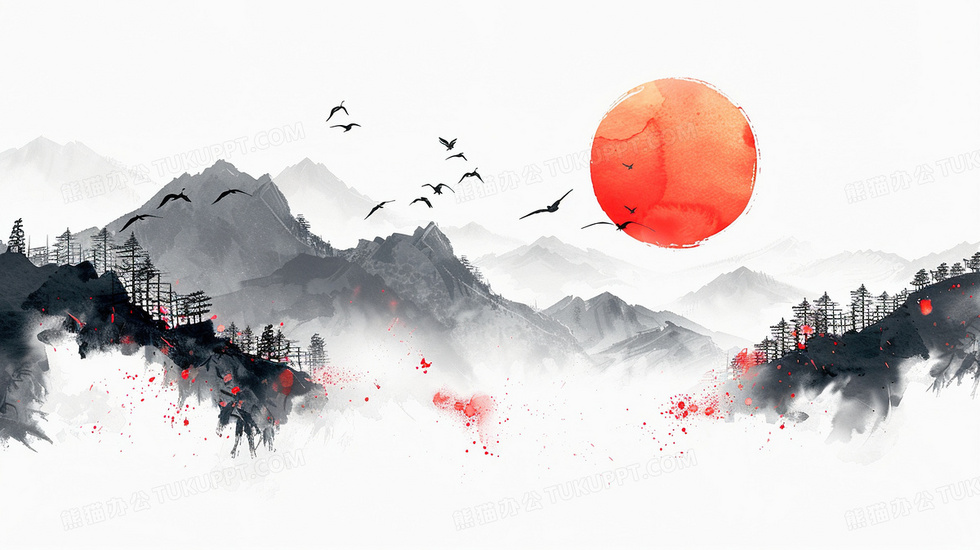 本作品内容为红日山水中国风水墨古风背景, 格式为 jpg, 大小2 MB, 图片尺寸为2912 x 1632, 作品中背景图片无需修改, 源文件无水印,可以直接使用, 欢迎使用熊猫办公。 如认为平台内容涉嫌侵权,可通过邮件:tousu@tukuppt.com提出书面通知,我们将及时处理。