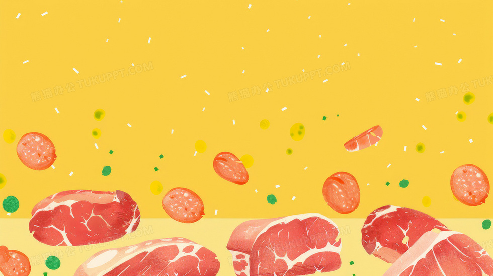 本作品内容为卡通生鲜肉类背景, 格式为 jpg, 大小6 MB, 图片尺寸为2912 x 1632, 作品中背景图片无需修改, 源文件无水印,可以直接使用, 欢迎使用熊猫办公。 如认为平台内容涉嫌侵权,可通过邮件:tousu@tukuppt.com提出书面通知,我们将及时处理。