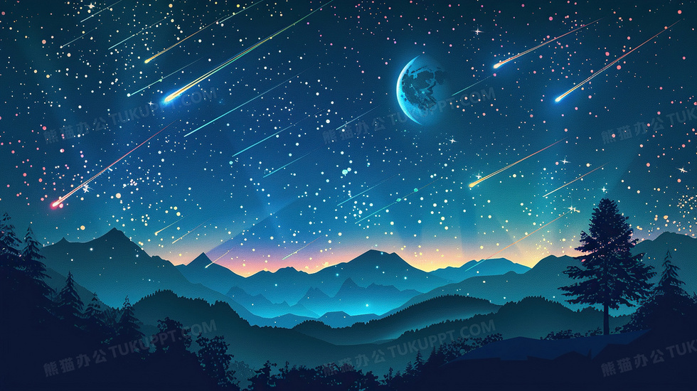 本作品内容为梦幻森林星空风景背景, 格式为 jpg, 大小4 MB, 图片尺寸为2912 x 1632, 作品中背景图片无需修改, 源文件无水印,可以直接使用, 欢迎使用熊猫办公。 如认为平台内容涉嫌侵权,可通过邮件:tousu@tukuppt.com提出书面通知,我们将及时处理。