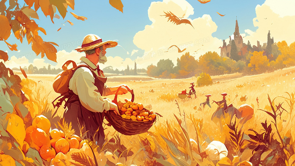 本作品内容为秋季丰收采摘水果的果农插画, 格式为 jpg, 大小3 MB, 图片尺寸为2912 x 1632, 源文件无水印, 欢迎使用熊猫办公。 如认为平台内容涉嫌侵权,可通过邮件:tousu@tukuppt.com提出书面通知,我们将及时处理。