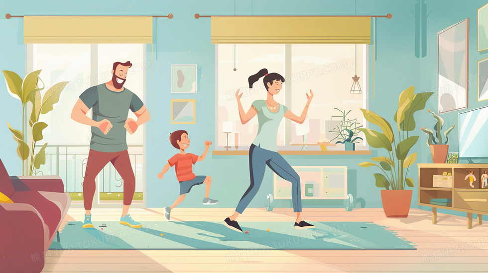 本作品内容为清晨父母和孩子在房间跳操运动插画, 格式为 jpg, 大小3 MB, 图片尺寸为2912 x 1632, 源文件无水印, 欢迎使用熊猫办公。 如认为平台内容涉嫌侵权,可通过邮件:tousu@tukuppt.com提出书面通知,我们将及时处理。