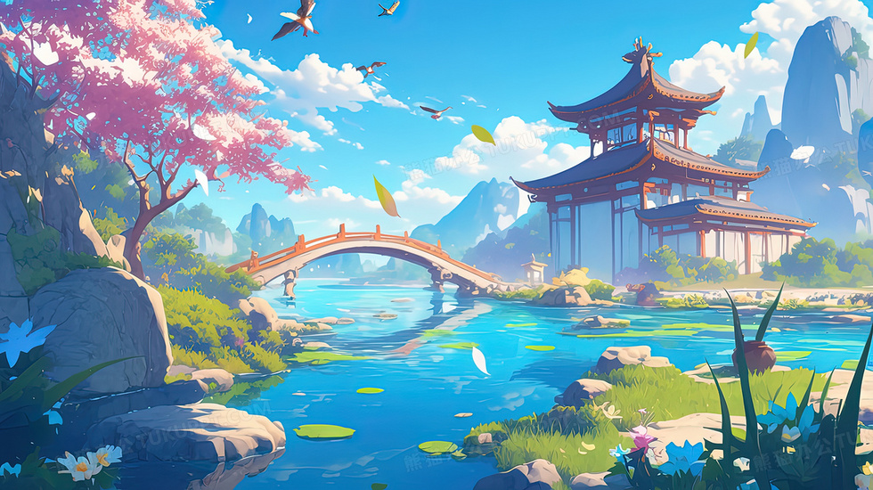 本作品内容为蓝天白云山水古建筑风景插画, 格式为 jpg, 大小3 MB, 图片尺寸为2912 x 1632, 源文件无水印, 欢迎使用熊猫办公。 如认为平台内容涉嫌侵权,可通过邮件:tousu@tukuppt.com提出书面通知,我们将及时处理。