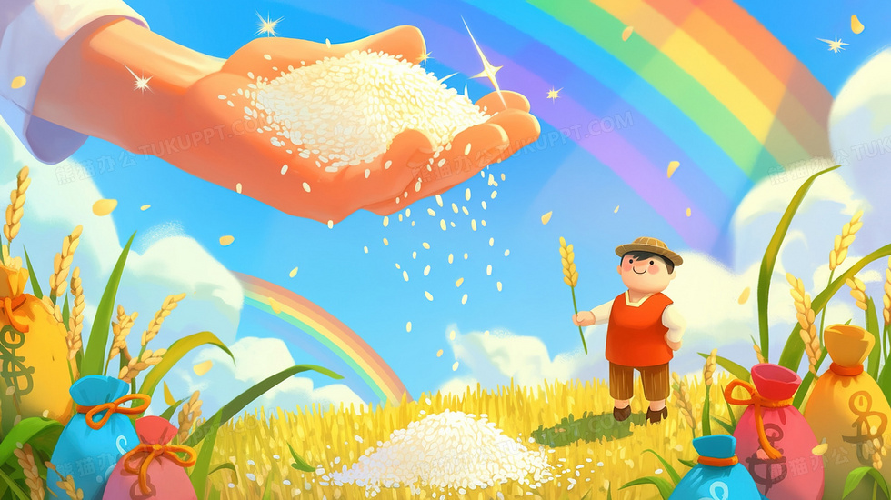本作品内容为天空彩虹手掌心的白大米微距创意插画, 格式为 jpg, 大小3 MB, 图片尺寸为2912 x 1632, 源文件无水印, 欢迎使用熊猫办公。 如认为平台内容涉嫌侵权,可通过邮件:tousu@tukuppt.com提出书面通知,我们将及时处理。