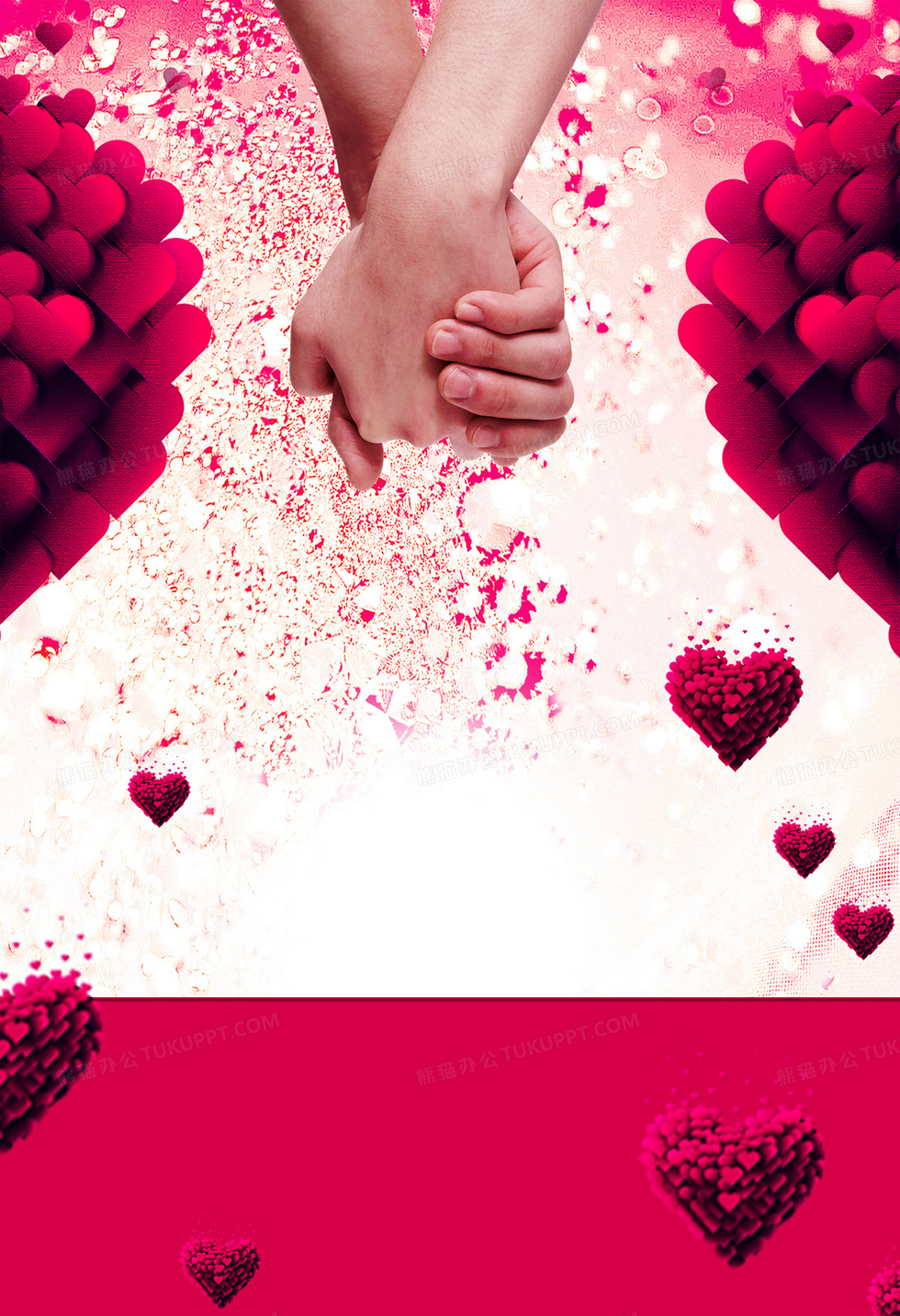 本作品内容为红色牵手情人节爱情海报背景, 格式为 psd, 图片尺寸为2953 x 4318, 作品中背景图片无需修改, 源文件无水印,可以直接使用, 欢迎使用熊猫办公。 如认为平台内容涉嫌侵权,可通过邮件:tousu@tukuppt.com提出书面通知,我们将及时处理。