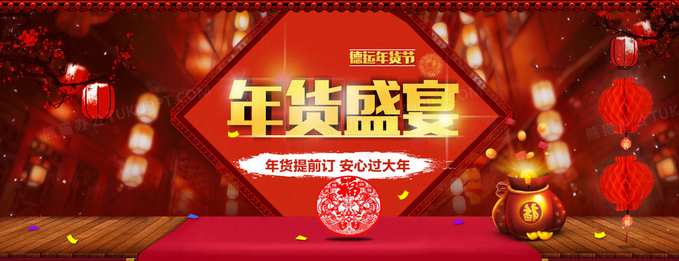 本作品内容为年货喜庆海报背景, 格式为 psd, 图片尺寸为1920 x 739, 作品中背景图片无需修改, 源文件无水印,可以直接使用, 欢迎使用熊猫办公。 如认为平台内容涉嫌侵权,可通过邮件:tousu@tukuppt.com提出书面通知,我们将及时处理。