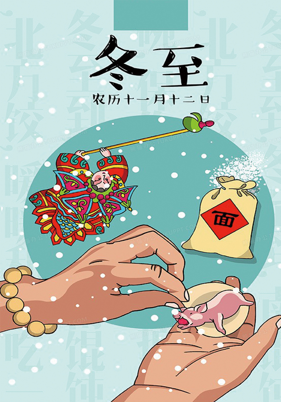 本作品内容为青色包饺子冬至背景图, 格式为 psd, 图片尺寸为3500 x 5000, 作品中背景图片无需修改, 源文件无水印,可以直接使用, 欢迎使用熊猫办公。 如认为平台内容涉嫌侵权,可通过邮件:tousu@tukuppt.com提出书面通知,我们将及时处理。