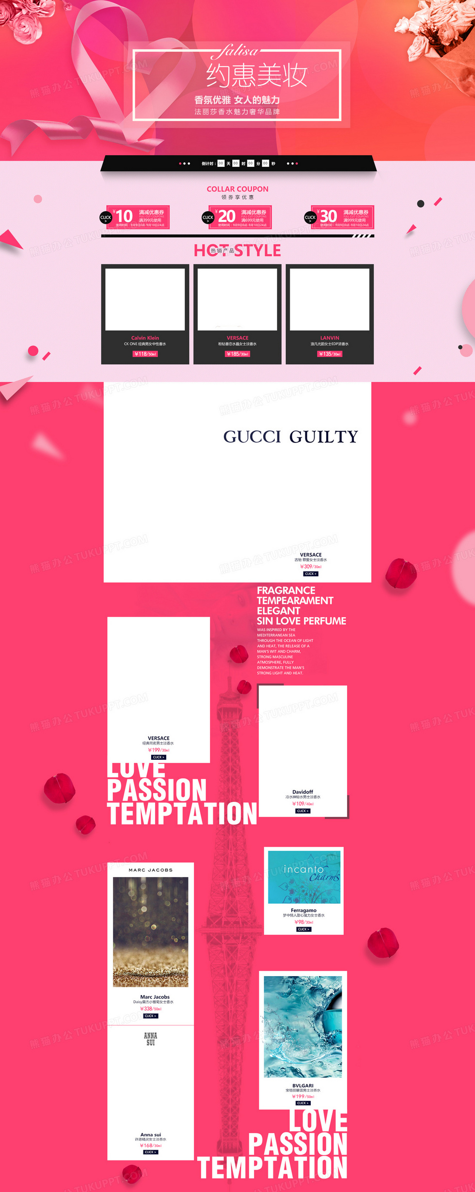 本作品内容为粉色浪漫花卉情人节美妆店铺首页背景, 格式为 psd, 图片尺寸为1920 x 4815, 作品中背景图片无需修改, 源文件无水印,可以直接使用, 欢迎使用熊猫办公。 如认为平台内容涉嫌侵权,可通过邮件:tousu@tukuppt.com提出书面通知,我们将及时处理。