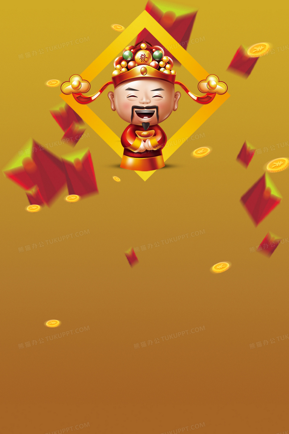 本作品内容为金色红包财神爷背景, 格式为 psd, 图片尺寸为2240 x 3360, 作品中背景图片无需修改, 源文件无水印,可以直接使用, 欢迎使用熊猫办公。 如认为平台内容涉嫌侵权,可通过邮件:tousu@tukuppt.com提出书面通知,我们将及时处理。