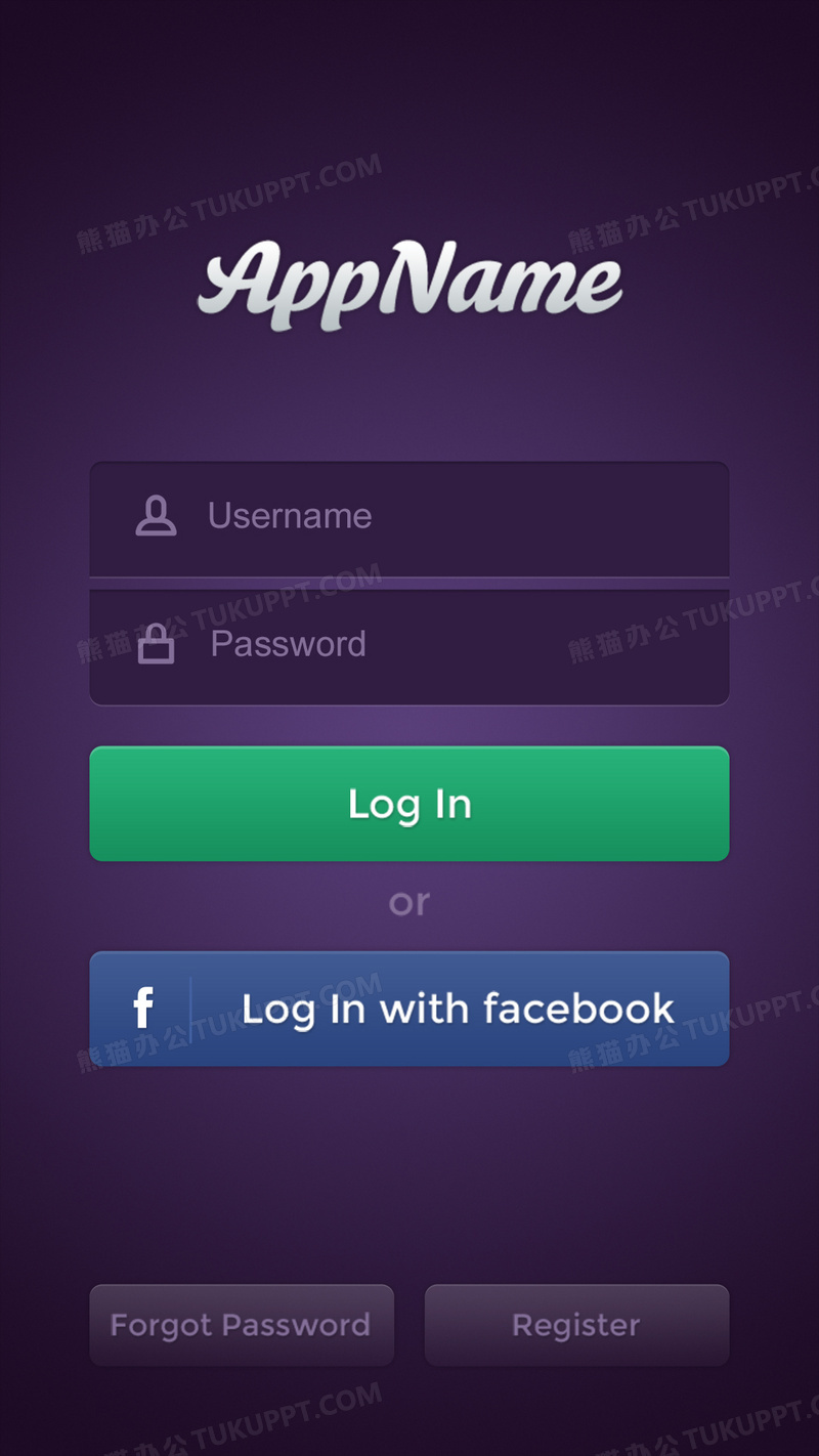 本作品内容为手机APP用户登录界面免费下载, 格式为 psd, 图片尺寸为1080 x 1920, 作品中背景图片无需修改, 源文件无水印,可以直接使用, 欢迎使用熊猫办公。 如认为平台内容涉嫌侵权,可通过邮件:tousu@tukuppt.com提出书面通知,我们将及时处理。