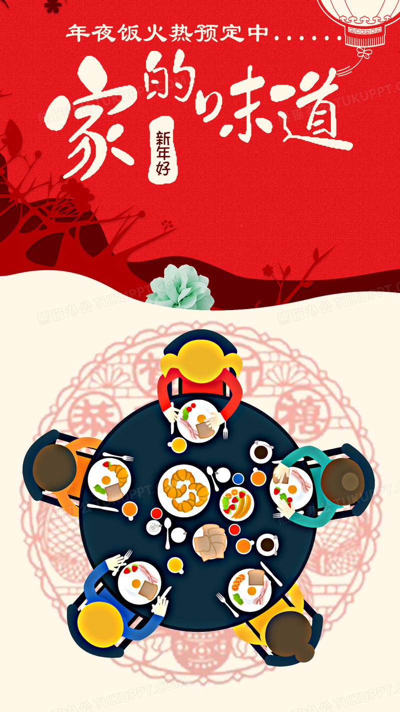 本作品内容为家的味道扁平年夜饭预订H5背景, 格式为 psd, 图片尺寸为1080 x 1920, 作品中背景图片无需修改, 源文件无水印,可以直接使用, 欢迎使用熊猫办公。 如认为平台内容涉嫌侵权,可通过邮件:tousu@tukuppt.com提出书面通知,我们将及时处理。