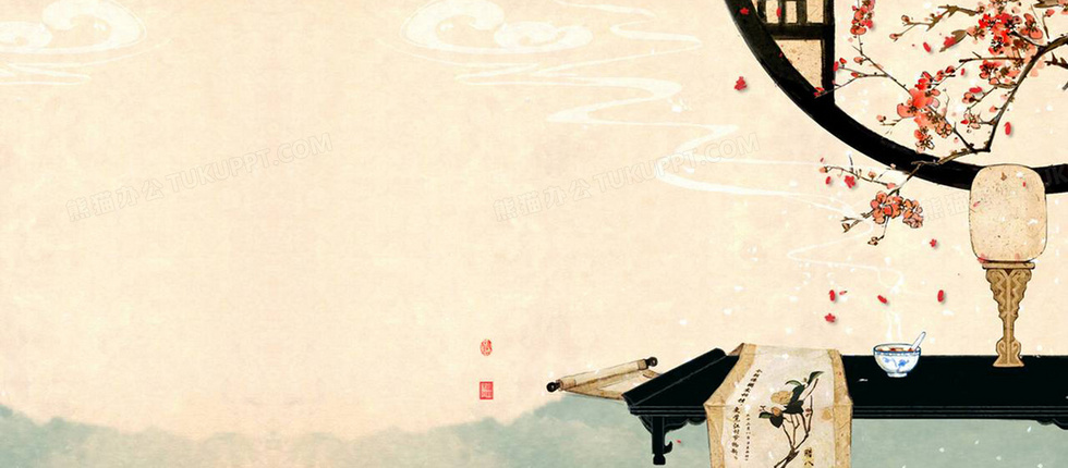 本作品内容为中国风古物语书桌背景, 格式为 jpg, 图片尺寸为1920 x 842, 作品中背景图片无需修改, 源文件无水印,可以直接使用, 欢迎使用熊猫办公。 如认为平台内容涉嫌侵权,可通过邮件:tousu@tukuppt.com提出书面通知,我们将及时处理。