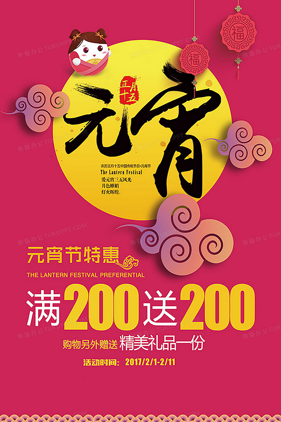 本作品内容为元宵佳节海报, 格式为 psd, 图片尺寸为2665 x 3997, 作品中背景图片无需修改, 源文件无水印,可以直接使用, 欢迎使用熊猫办公。 如认为平台内容涉嫌侵权,可通过邮件:tousu@tukuppt.com提出书面通知,我们将及时处理。