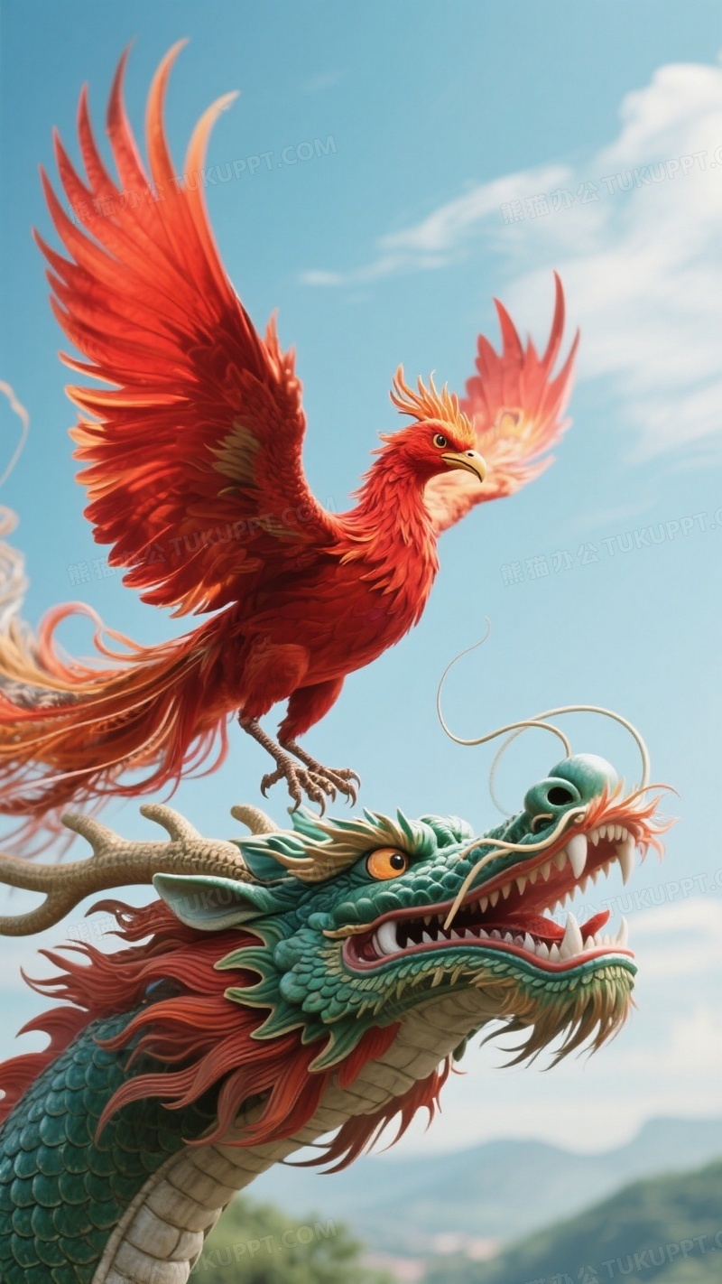 本作品内容为一只火红的凤凰在一条青龙的头顶盘旋, 格式为 jpg, 大小1 MB, 图片尺寸为936 x 1664, 源文件无水印, 欢迎使用熊猫办公。 如认为平台内容涉嫌侵权,可通过邮件:tousu@tukuppt.com提出书面通知,我们将及时处理。