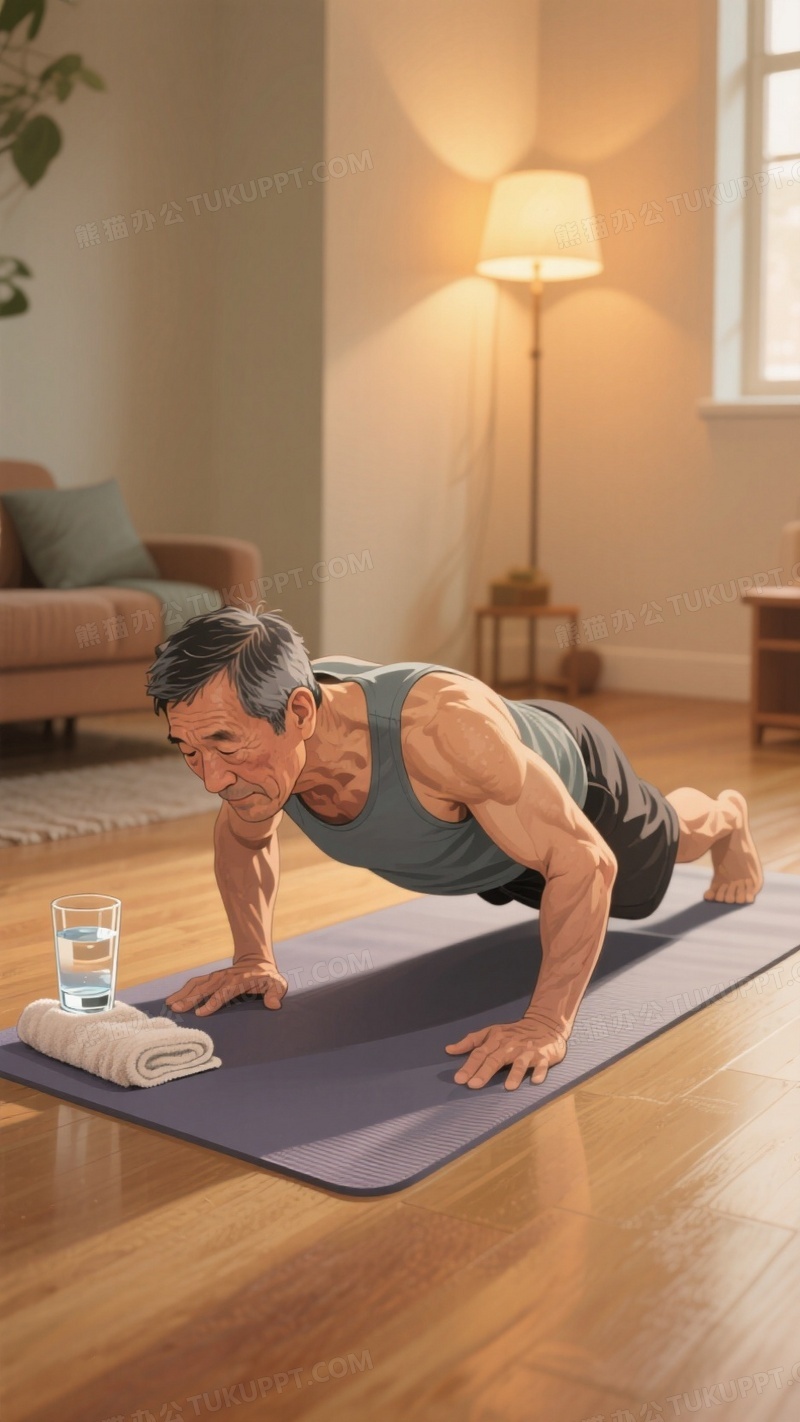 本作品内容为写实风格公益插画一名中年男子在瑜伽垫上做着俯卧撑, 格式为 jpg, 大小1 MB, 图片尺寸为936 x 1664, 源文件无水印, 欢迎使用熊猫办公。 如认为平台内容涉嫌侵权,可通过邮件:tousu@tukuppt.com提出书面通知,我们将及时处理。