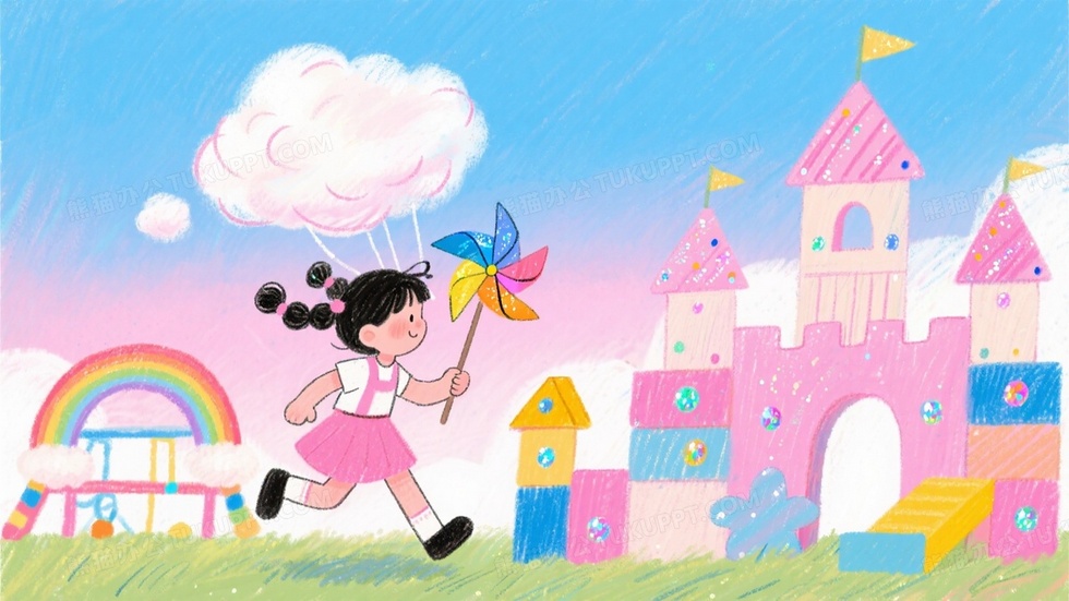 本作品内容为手绘蜡笔质感插画扎羊角辫女孩推着彩虹风车奔跑, 格式为 jpg, 大小1 MB, 图片尺寸为1664 x 936, 源文件无水印, 欢迎使用熊猫办公。 如认为平台内容涉嫌侵权,可通过邮件:tousu@tukuppt.com提出书面通知,我们将及时处理。