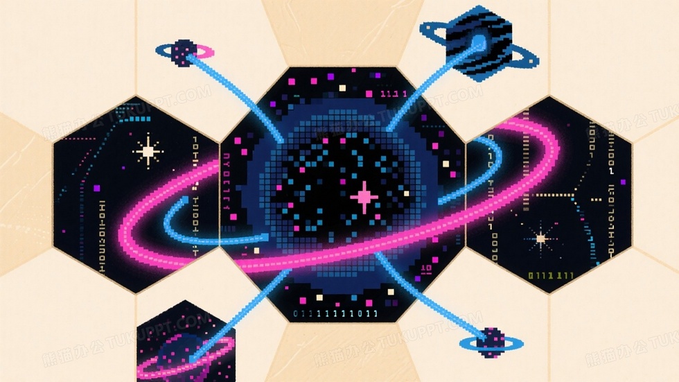 本作品内容为抽象几何银河系插画六边形模块拼接行星环, 格式为 jpg, 大小1 MB, 图片尺寸为1664 x 936, 源文件无水印, 欢迎使用熊猫办公。 如认为平台内容涉嫌侵权,可通过邮件:tousu@tukuppt.com提出书面通知,我们将及时处理。