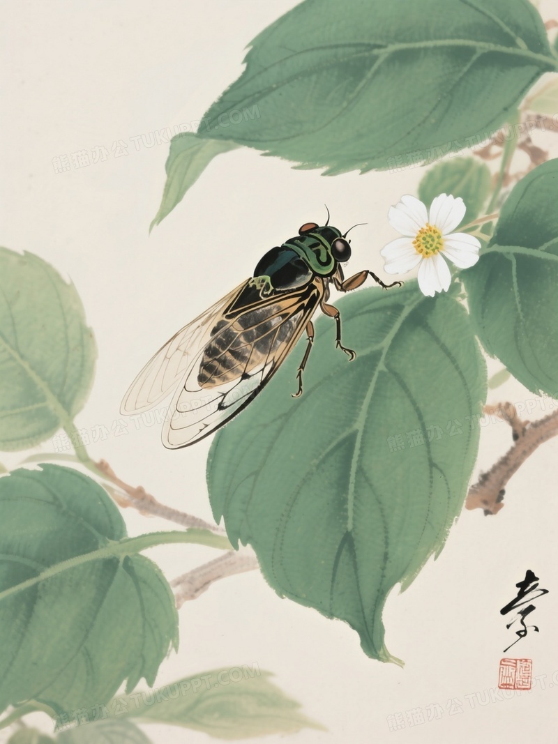 本作品内容为齐白石大师之作鸣蝉落在一片翠绿的树叶上, 格式为 jpg, 大小1 MB, 图片尺寸为1104 x 1472, 源文件无水印, 欢迎使用熊猫办公。 如认为平台内容涉嫌侵权,可通过邮件:tousu@tukuppt.com提出书面通知,我们将及时处理。