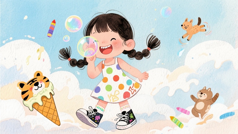 本作品内容为水彩手绘儿童节特写双马尾女孩吹泡泡时笑出小虎牙, 格式为 jpg, 大小1 MB, 图片尺寸为1664 x 936, 源文件无水印, 欢迎使用熊猫办公。 如认为平台内容涉嫌侵权,可通过邮件:tousu@tukuppt.com提出书面通知,我们将及时处理。
