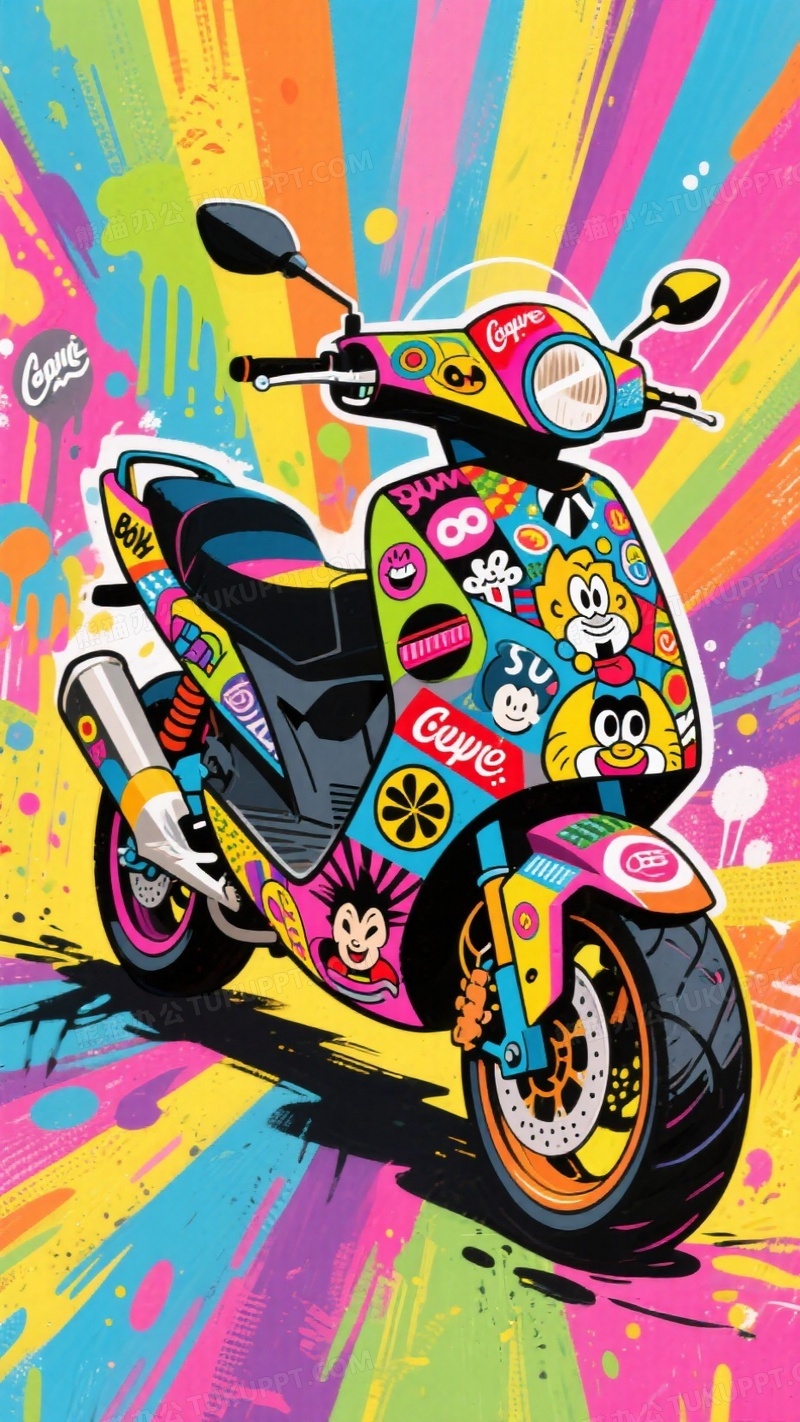 本作品内容为波普风格摩托车插画大胆的色彩和夸张的图形组合, 格式为 jpg, 大小1 MB, 图片尺寸为936 x 1664, 源文件无水印, 欢迎使用熊猫办公。 如认为平台内容涉嫌侵权,可通过邮件:tousu@tukuppt.com提出书面通知,我们将及时处理。