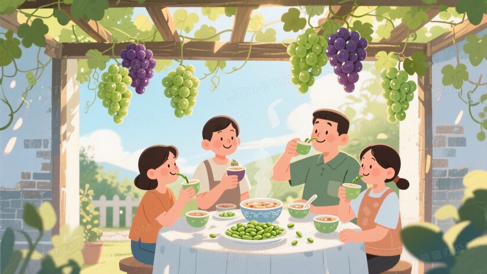 本作品内容为夏天的卡通风格插画一家人在庭院的葡萄架下喝绿豆汤解暑, 格式为 jpg, 大小1 MB, 图片尺寸为1664 x 936, 源文件无水印, 欢迎使用熊猫办公。 如认为平台内容涉嫌侵权,可通过邮件:tousu@tukuppt.com提出书面通知,我们将及时处理。