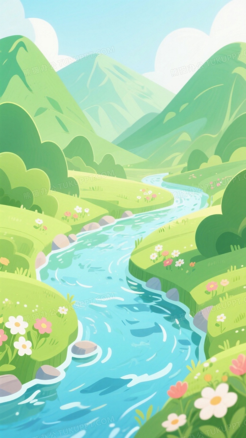 本作品内容为卡通插画风格的画面绿色山川围绕着溪流, 格式为 jpg, 大小1 MB, 图片尺寸为936 x 1664, 源文件无水印, 欢迎使用熊猫办公。 如认为平台内容涉嫌侵权,可通过邮件:tousu@tukuppt.com提出书面通知,我们将及时处理。