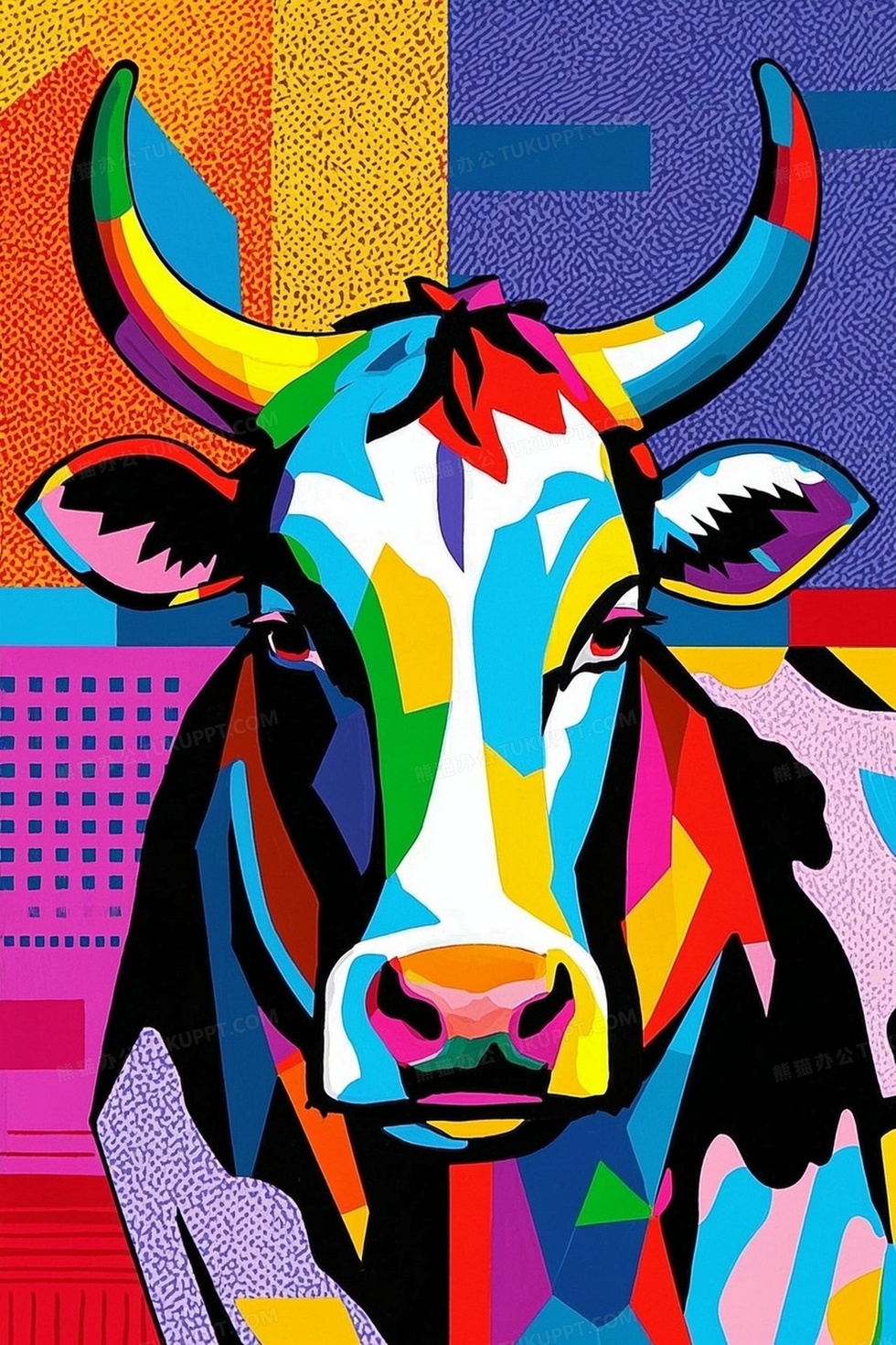本作品内容为一只奶牛头像抽象波普艺术矢量插图, 格式为 jpg, 大小2 MB, 图片尺寸为1536 x 2304, 作品中背景图片无需修改, 源文件无水印,可以直接使用, 欢迎使用熊猫办公。 如认为平台内容涉嫌侵权,可通过邮件:tousu@tukuppt.com提出书面通知,我们将及时处理。