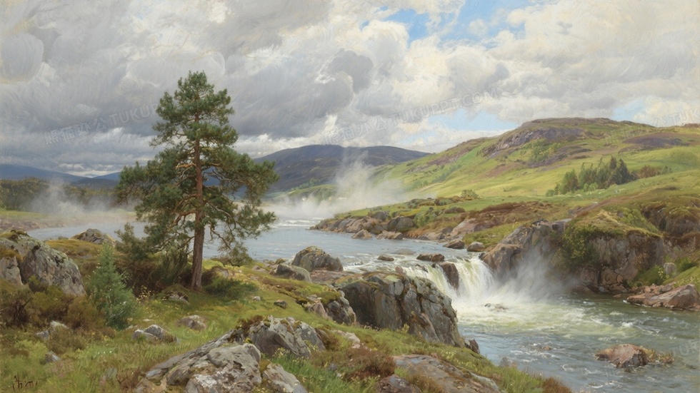 本作品内容为油画风格全景画面自然山水景致, 格式为 jpg, 大小1 MB, 图片尺寸为1664 x 936, 源文件无水印, 欢迎使用熊猫办公。 如认为平台内容涉嫌侵权,可通过邮件:tousu@tukuppt.com提出书面通知,我们将及时处理。