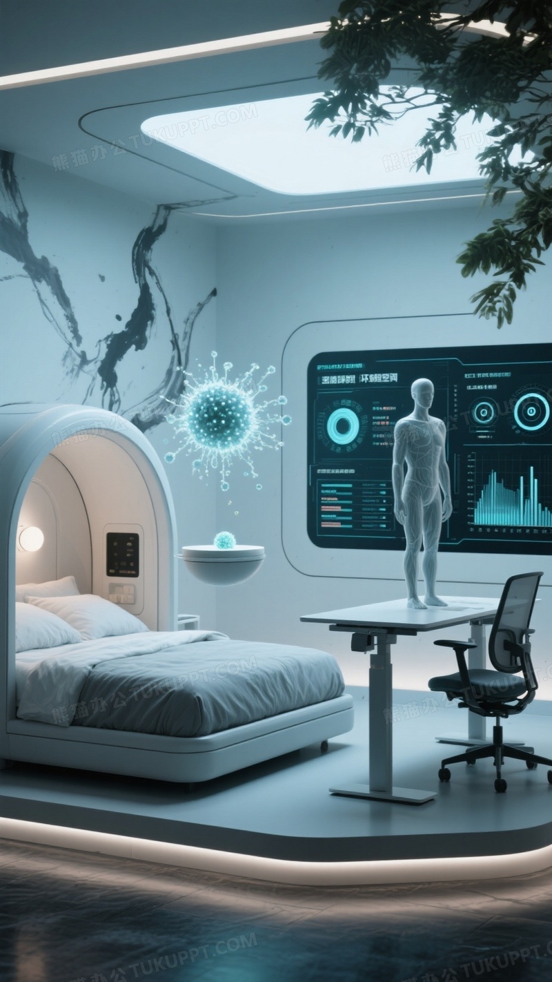 本作品内容为智能养生空间卧室恒温舱内漂浮的负离子粒子与办公区升降桌交替站立的人体工学设计, 格式为 jpg, 大小1 MB, 图片尺寸为936 x 1664, 源文件无水印, 欢迎使用熊猫办公。 如认为平台内容涉嫌侵权,可通过邮件:tousu@tukuppt.com提出书面通知,我们将及时处理。