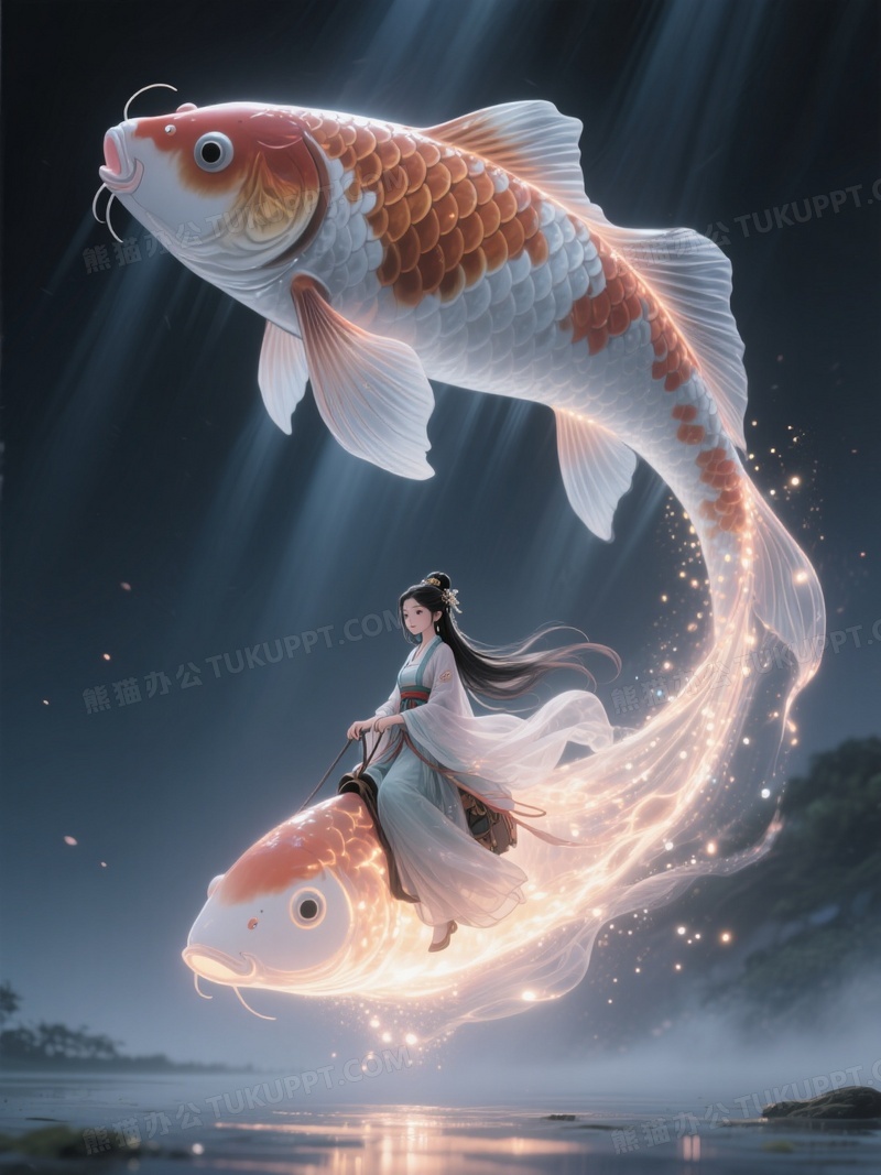 本作品内容为一个缩小古装美女骑在一条巨大从天而降的锦鲤, 格式为 jpg, 大小1 MB, 图片尺寸为1104 x 1472, 源文件无水印, 欢迎使用熊猫办公。 如认为平台内容涉嫌侵权,可通过邮件:tousu@tukuppt.com提出书面通知,我们将及时处理。