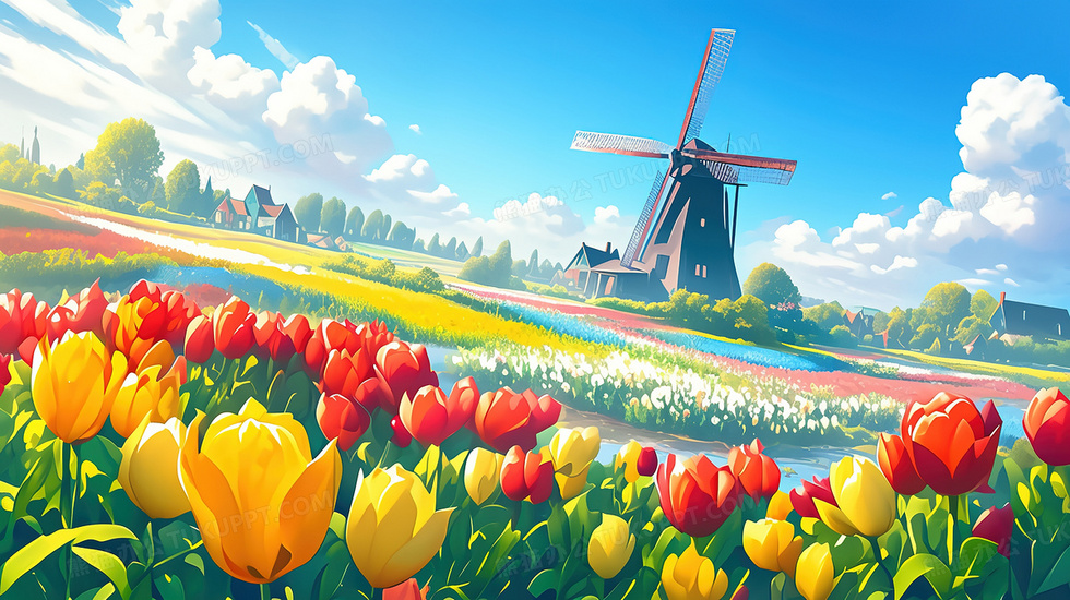 本作品内容为唯美风荷兰风车转动郁金香花田的插画, 格式为 jpg, 大小3 MB, 图片尺寸为2912 x 1632, 源文件无水印, 欢迎使用熊猫办公。 如认为平台内容涉嫌侵权,可通过邮件:tousu@tukuppt.com提出书面通知,我们将及时处理。